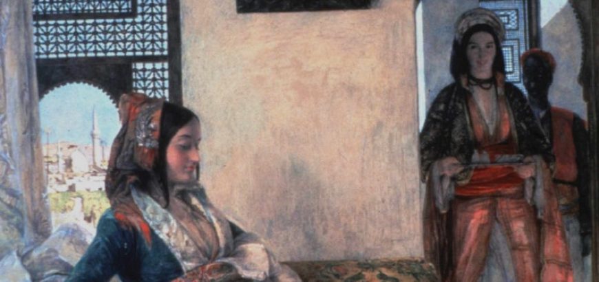 In a courtyard rimmed by a brightly tiled colonnade, women sit on a dark carpet, surrounded by two male guards